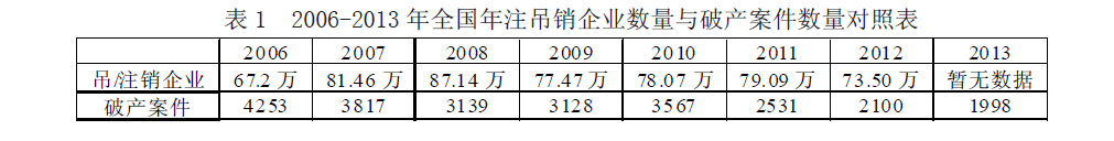 [4]关于吊/注销企业及破产案件数量的统计,参见李曙光、王佐发:《中国〈破产法〉实施三年的实证分析——立法预期与司法实践的差距及其解决路径》,载李曙光、郑志斌主编:《公司重整法律评论》(第3卷),法律出版社2013年版,第501页、第518页;国家工商总局企业注册局、信息中心:《全国内资企业生存时间分析报告》,http://www.saic.gov.cn/zwgk/tjzl/zxtjzl/xxzx/201307/P020130731318661073618.pdf,2014年3月17日访问;周强:《最高人民法院工作报告(摘要)》,《人民日报》2014年3月11日。需要说明的是,对于注/吊销企业数量,所引数据存在冲突的,以国家工商总局的数据为准;对于破产案件数量,2010年至2013年的数量为审结数量。