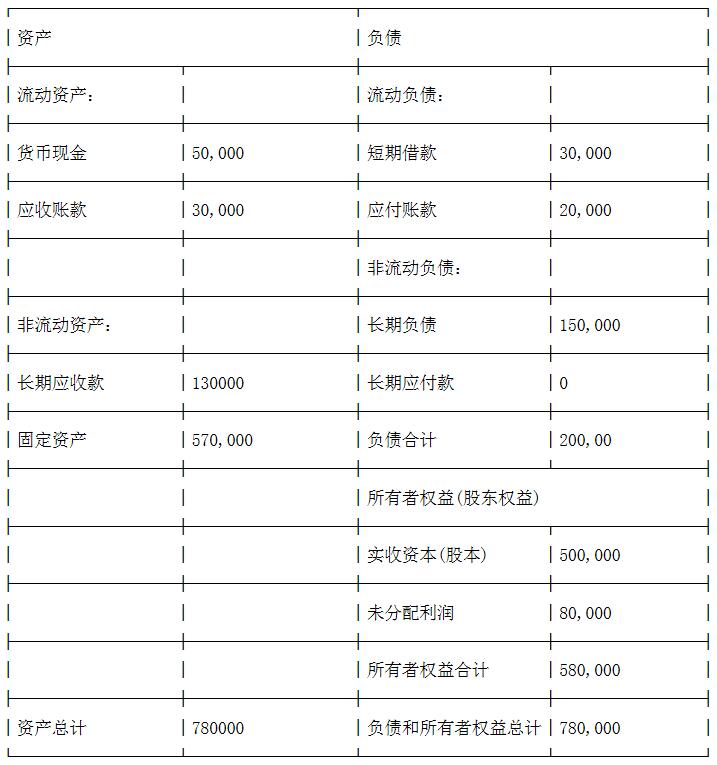 在公司设立之时,公司股东向公司投入的财产构成公司的全部资产,在资产负债表中表现为最简单的模型,[22]就是“公司资产=公司资本(股本)”(详见表1)。这就是国内学者所指的资本信用,实务中公司债权人关注公司股东向公司投入了多少财产以及是否足额清偿自己的债务意义不大,因为这种静态的固定的资产状况只是一种美好的假定。当公司开始经营活动后,就会产生盈利、负债等科目,公司资产结构也会变得更加复杂,在上面公式等号的右侧,一方面原来的公司资本(股本)添入资本公积金、盈余公积金、未分配利润等扩大为所有者权益(股东权益),另一方面增加了公司的举债列为负债方,所以原来的公式变为“公司资产=负债+所有者权益(股东权益)”,同时,按照流动性,资产按变现能力可分为流动资产、非流动资产,负债按还债期限可分为流动负债、非流动负债(详见表2、表3)。为解说两种偿付不能标准,笔者以不同情形的资产负债表加以说明。