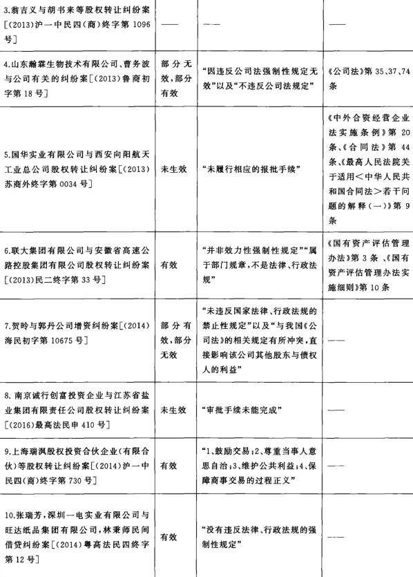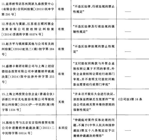 我国“对赌协议”纠纷裁判及其在业界引起的争论表明,目前我国商主体与商事法官对“对赌协议”纠纷的理解集中在合同条款的效力问题,并将其与公司法强制规范相关联。在某机构发布的研究报告,[41]提及的18份“对赌协议”“典型案例”裁判文书中,剔除原审认定事实不清、发回重审的情况[42]以及案件争议实质上与“对赌协议”的合同内容无关的情况,[43]本文共得到16份有效的裁判文书。[44]在这16份裁判文书中,仅有1份不涉及“对赌协议”的效力问题。[45]也就是说,93.75%的“对赌协议”纠纷被定位为或者部分定位为“对赌协议”的效力问题。在论及该问题时,无论是有效判决还是无效判决,基本上均以“不违反法律、行政法规的强制性规定”“不违反法律法规的禁止性规定”“非效力性强制性规定”或者“因违反《中华人民共和国公司法》强制性规定无效”“与我国《公司法》的相关规定有所冲突”“有违公司法相关资本维持原则的强制性规定”等来支撑结论。[46]至于关联于合同效力的强制性规定,多援引公司法关于债权人保护、资本维持原则的强制性规定。[47](参见表一)