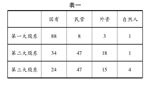 由于政治和历史的原因,国有股在我国公司中占有特殊的地位,尽管经历了多轮国退民进的改革(如国有股减持、股权分置) ,但国有公司所占经济总量的份额依然巨大,在上市公司中国有股也基本上一股独大,第一大股东的持股份额远远高于其他股东的持股份额。例如,根据2010年5月19日中国社会科学院公司治理研究中心与甫瀚咨询联合推出的《2010年中国上市公司 100 强公司治理评价》报告,我国88% 的公司第一大股东为国有性质,第二大股东和第三大股东中,国有股东也分别达到 34% 和 24%,比2009 年度还略有上升(2009年度此三项数据分别为86% 、32% 、23% ) (见下表一)。因此,国有股权高度集中是我国国有公司股权结构的基本特征。