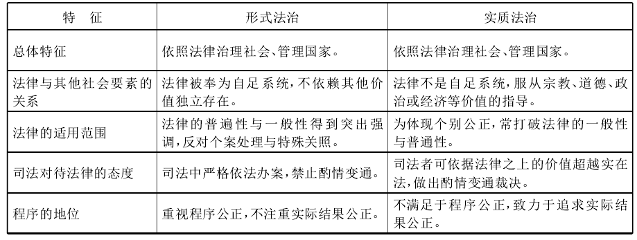 中国的法治进程有着复杂的路径,即便从中国法律体系的复杂性就可见一斑。对这套体系来说,单纯用“内生型”或“移植型”都不足以概括其复杂程度,郭星华干脆认为这是一种“混合型”的法律体系[22]。因为这个体系既有借鉴、移植自国外的内容,又保留了中国革命与建设时期的一些法律传统,还对中国古代法律文化有所借鉴,甚至一些与市场经济同步生成的规则要素也被及时纳入进来。不仅如此,数量极其丰富的法律解释(尤其是司法解释)也构成了法律的渊源,成为法律适用的前提和补充法律漏洞的有效工具。法治的运行则更涉及到中国整个权力结构的布局。随着国家治理方式的重大变迁,依法治国、依法执政、依法行政成为总体性和核心性的战略,法治国家、法治政府与法治社会成为一体化建设的目标。中国法治的特殊性在于,从社会的权力结构来看,法治建设是在原有的政治架构中,由来自法治之外的力量(政党、政府)推行和主导的,在这样的法治中,虽然也是在一定程度上或常态上依照法律治理社会、管理国家,但法律本身还不是一个自足的系统,需要特定政治、经济、道德、宗教等价值的指导[23]。由于行政权力乃至执政党伦理都是高于法律权威的力量,这使得中国的法治更多地具有实质法治的特点。高鸿均等将此归纳为“实质法治社会”(表一):