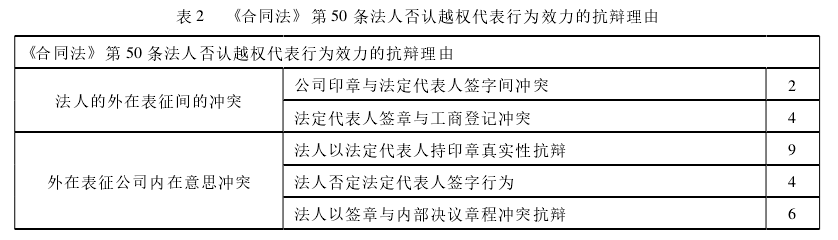 表2展示,通过对《合同法》第50条进行法条检索,本文归纳出法人否认越权代表行为应归属于法人的三种抗辩理由:第一种,通过公司股东会大会的免职决议[4]以证明签订合同时行为人已不具备《合同法》第50条所规定的“法人或其他组织的法定代表人和负责人”的任免资格,以否认法定代表人任职资格向交易相对人抗辩。第二种,法定代表人个人意思与企业法人意思冲突抗辩。其中包含主张法定代表人签约行为仅代表其个人、法定代表人行为与董事会决议和公司章程规定相冲突两种情形,[5]证明行为人的行为非企业法人的意思。第三种,印章的真实性抗辩。通过证明印章未经公安局备案、私刻、与工商局存档的印章形状不符[6]等理由认为行为人对外交易行为非法人的表示。