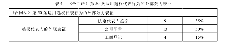 表4显示,公司印章在越权代表行为外部效力表征类型中所占比例最高,占50%,包括公司印章是否真实[7]9个、公司印章与法定代表人个人签章[8]相冲突的案件样本6个,公司印章与公司内部决议冲突的案件样本6个。有以下三种类型:其一,企业法人以所持印章真伪否认越权代表的效力归属于法人,在一般情况下,法官免除了交易相对人的调查义务。其二,对于只有法定代表人签字,没有公司印章。判断其越权代表行为是其个人行为还是企业法人行为,既要“看作为合同相对人而言,他是否有足够理由相信法定代表人的签约行为是代表公司的行为”,又要看“是否以公司名义”。其三,因法定代表人取走公司公章、公司专用章和营业执照致使公司无法正常开展,无法提起诉讼。[9]