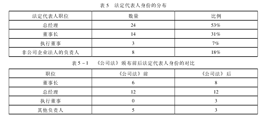 表5显示,从我国企业法人的法定代表人身份分布上看,总经理和董事长所占比例最高,总经理所占比例甚至超过了50%。尤其需要注意的是,表5-1显示,现行公司法实施前,总经理担任法定代表人的案件样本有12个,超过了由董事长担任法定代表人的数目。如果将总经理担任法定代表人身份的发生时间横向展开,发现这一时期,案件样本所适用的1993年《公司法》规定,只能由董事长担任法定代表人。换句话说,承担企业法人内部业务执行权的总经理也一直实然地兼顾着企业法人的对外代表职能。这与“我国将法人的执行机关与代表机关在制度上进行了分解……法人的事务执行与对外代表机关分离是法定代表人的中国特色”[10]的规范认知不同。
