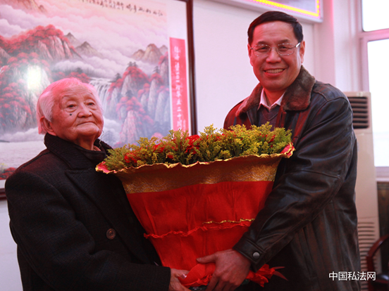 会议的最后,祝贺单位以及李老的学生们向李静堂教授敬献了礼品,吴汉东教授作为曾受教于他的学生代表,向李老献上代表诚挚祝福的99朵康乃馨,祝福李老延年益寿,相约百岁再贺。全体与会人员与李老一起合影留念。