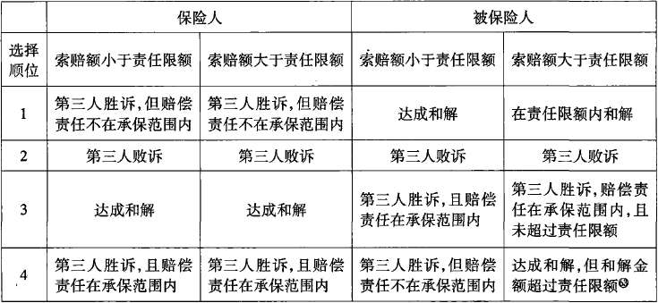 [63]被保险人还可能面临更差的结果,即第三人胜诉,赔偿责任在承保范围内,但超过责任限额,甚至是第三人胜诉,赔偿责任不在承保范围内。