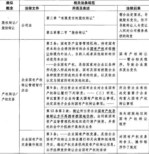 与股权转让有类似功能的还有“产权转让”。中国法语境下的“企业产权”多数情形下是指国家基于其出资而对国企所拥有的权益,这种权益其实就是股权。只是在少数地方性规章中,所谓产权还指其他财产权,例如,“是指包括物权、债权、股权、知识产权等各类财产权利”。在这种意义上,产权转让又有些类似于企业财产转让。之所以形成此种产权等于财产权的认识,在很大程度上还是基于对国企出资人的特殊保护。因为,2005年前中国《公司法》曾经规定,公司中的国有资产所有权属于国家。[54]在这种观念上,国家对企业的产权就“穿越了股权面纱”,直接针对企业财产——产权转让也就被设计成或者误会成“企业财产转让”的性质了。以下分别具体分析产权转让的这两种情形及其与营业转让的等值功能。