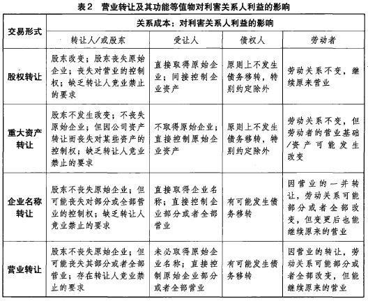 如前所述,在中国法上,虽然没有系统性、完整性的营业转让辦度,但存在功能类似的股权转让、重大资产转让、企业出售、企业名称转让等诸多制度,这些制度虽或多或少与经典的营业转让制度间存在一些实质/本质差异,要么主体不同,要么法律后果不同,要么对营业资源、劳动资源的转让要求不同……,但确在很大程度上填补了欠缺营业转让制度的缺陷,实现或者部分实现了营业转让制度所意图实现的经济及法律效果。因此,从法律的关系成本角度考虑,关于营业转让的制度,中国需要反思其内在的功能——我们到底希望借助营业转让制度解决什么问题,满足何种利益群体的何种需求?是从主体角度——重点考虑企业营业终极控制人/实际控制人的替换问题?还是从客体角度——重点考虑企业营业本身的持续/维持问题?对于前者,显然各种替代性制度能够实现营业转让的功能;对于后者,则替代性制度的功能相对有限。因此,如果这是主要的规制目的,则我们需要更加关注,如何通过营业转让的交易行为,使营业财产的整体价值功能得以实现和延续。