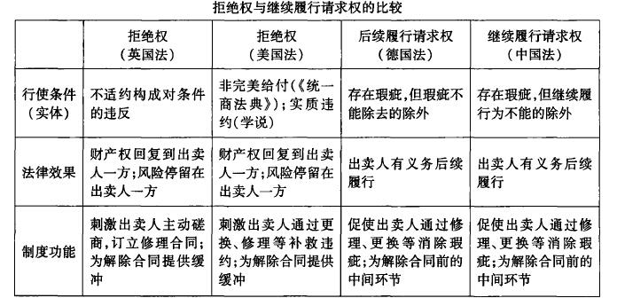从行使条件来看,如果标的物在质量、数量方面实质性地违反合同约定,则拒绝权和继续履行请求权通常均可发动,但是,拒绝权的行使条件比继续履行请求权更宽松的地方在于,前者不必在乎标的物上的瑕疵能否或者是否适于消除,而后者则必须受瑕疵能否除去的影响;前者不存在因费用过高而效力中止的问题,而后者则可能因费用过高或者物的瑕疵不适于消除而遭到出卖人拒绝。从法律效果来看,拒绝权和继续履行请求权差别较大。继续履行请求权的主要法律效果在于出卖人应作出继续履行行为,而拒绝权的行使效果则主要体现为将财产权回复到出卖人一方,并使风险停留在出卖人一方。有学者指出,英美法上拒绝权与大陆法上解除权的行使效果更为接近,只不过前者是一项在短期(short-term)内发挥效果的制度。[60]