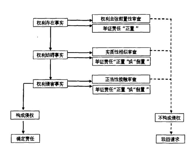 在一般侵犯知识产权案件中,司法审査的逻辑顺序和举证责任分配是按照“实质性相似+接触”规则构成要素展开的。首先,进行权利主张的前置性审查。由原告就知识产权存在事实即权利的真实性、有效性、存续性等提供证明,这是权利主张得以成立的前提。在其权利存在事实得到证明后,案件审查和规则适用得继续进行。针对原告主张,被告可以进行否定知识产权效力的抗辩,具体包括权利不存在的抗辩、权利未生效的抗辩、权利已过保护期的抗辩等。上述否定权利效力的抗辩如能成立,下一步的案件审查和事实要素证明无须继续。其次,进行实质相似性审查。由原告就被控侵权物与权利保护对象的同一性或实质相似性提供证明,而被告可以进行不构成侵权的抗辩,例如作品合理使用的抗辩(著作权)、现有技术的抗辩(专利权)等。围绕着两项作品或技术所展开的比照分析,其事实证明和证据认定,是权利主张所涉事实真伪判断的重要环节,决定着侵权诉讼停止抑或继续的进程。最后,进行正当性接触审查。由原告就被告“接触”有知识产权的作品、技术或信息等提供证明,其证明的法律事实包括:原告的作品或技术先行存在或公开;被告有“接触”前述智力成果的条件和事实;被告“接触”前述智力成果具有目的的非正当性。被告针对原告主张的事实及其证据可以进行不视为侵权的抗辩,其事由包括独立研发、合法转让、反向工程等,以证明其智力成果的合法来源。