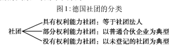 具有权利能力的社团才能具有法人资格,权利能力是法人的核心要素。根据权利能力的有无,社团可以分为有权利能力社团、无权利能力社团与部分权利能力社团。有权利能力社团就是社团法人,其典型是股份有限公司与有限责任公司。常见的无权利能力社团,是因为没有登记而未能具有权利能力的社团,如没有办理登记的书友会俱乐部。根据《德国民法典》第54条的规定,未登记社团适用民法上合伙的规定,即第705条及其后相关条款。这一规定受到学者的持续批评,德国最高法院的判例也认可民法上的合伙与未登记社团在某些关系中具有权利能力。部分权利能力处于中间状态,其代表是普通合伙企业(无限公司)。权利能力与社团的关系,可用下图表示。