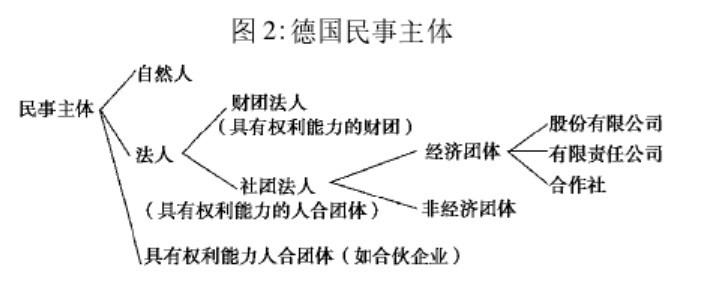 法人可以分为两类,一类是具有权利能力的财团,即财团法人;另一类是具有权利能力的社团,即社团法人。社团的本质特征在于其与成员是完全独立的。根据是否以经营经济事业为目的,社团可以分为非经济社团与经济社团。根据成立社团的法律依据不同,经济社团可以分为“依据《德国民法典》第22条成立的经济社团”与“依据其他法律成立的经济社团”。这种依据特别法成立的经济社团主要有股份有限公司、有限责任公司与合作社。在2000年6月《德国民法典》修改后,具有(部分)权利能力的人合团体获得第三类民事主体地位。德国现行法上的民事主体可以列图如下。