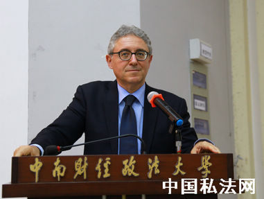 14:20,Antonio Palma教授首先作了题为“争议选择法:罗马法的一种认为符号”的学术讲座。Antonio Palma教授认为,当今世界主要存在五种法系,这五种法系产生于不同的法律传统,但却趋于统一。例如,中国法经历了“法——律——例”三个阶段,而罗马法则经历了“ 《十二表法》——市民法——注释法学——评述法学”等阶段。它们的共同之处在于拥有共同的历史进程。