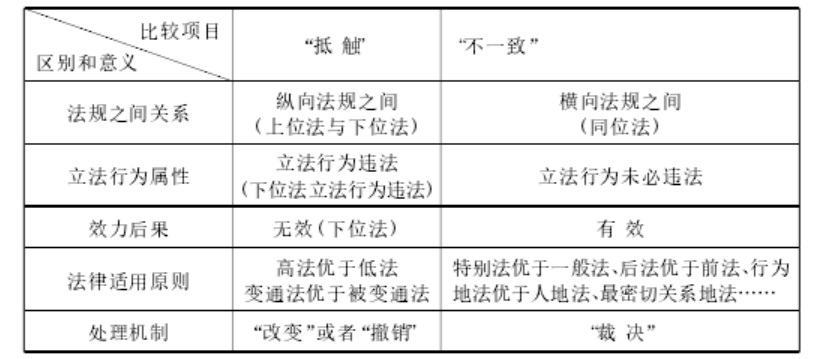 第三,法与法之间是否“一致”,是立法结果的比较,不是立法行为的比较。如下位法违反立法权限而制定,便属于立法行为违法而不是法与法之间是否一致的问题。第四,如果从法律冲突程度上说,认为只有纵向存在“抵触”、横向存在“不一致”,否认纵向也存在“不一致”和横向也存在“抵触”,那是不科学的,也很难为专家学者们普遍接受。