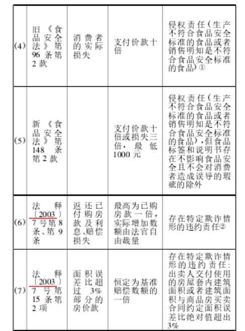 当然,在消费者权益极易遭受侵害的当下,将惩罚性赔偿扩张至这些并不明显具有恶性的行为,也符合理性。但在适用范围之外,这几类立法在赔偿标准上亦存在可商榷之处,(1)(2)(7)中的基准赔偿数额均不是消费者所遭受的实际损失,而是标的价款,这只是一种“原合同债务”,它通常并不能完全覆盖实际损失的范围。“原合同债务是当事人事先规定的义务,而损害赔偿责任是不履行或不完全履行原合同债务所产生的法律后果,是一种民事法律责任。损害赔偿责任的目的在于补偿受害人的全部损失。”【14】639