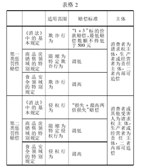 前述一揽子改革建议能显著改变因为规范的碎片化所造成的适用困难问题。目前消费者保护领域中的惩罚性赔偿制度,不但存在三种标准不一的类型的并行,而且在各类型内在之间也存在混乱和冲突的现象,而依笔者建议改革后的制度体系,则实际上是完全以《消法》的两款规定为基准,设定惩罚性赔偿制度的两个大类别,其他若干特别立法均在此基础上进行符合本领域特殊情况的变通适用。这既简化了规范体系,又根本上消除了存在适用冲突和困难的可能,可以通过表格2总结笔者的改革方案。当然,伴随着社会的发展和立法进程的深入,我们将来可能还要在除商品房销售和食品安全以外的其他领域进行消费者保护的特殊立法,如果有必要引入新的惩罚性赔偿制度,也应当按照笔者的建议,遵循前述逻辑,按照《消法》两种基本规定的模式进行立法,并按照新领域的特殊要求,相应调整各自的适用范围或赔偿标准。但是,要吸取教训,在任何消费者保护的特别立法中保持制度框架的异质性,不创设新的标准,防止由于规范语境的不一致再次产生适用困难的情形。