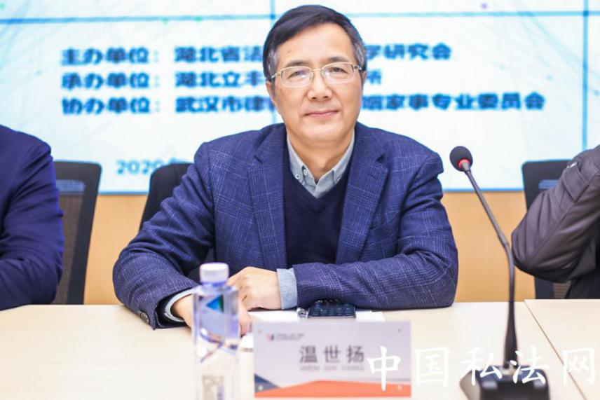 湖北省法学会民法学研究会温世扬会长致辞,首先对线上线下参会嘉宾、承办及协办单位的支持表示感谢。其次,介绍了民法典成立以来湖北省民法研究会为宣讲民法典所做的努力,如:响应湖北省法学会的号召,成立民法典宣讲团,深入社会各界宣讲民法典;武汉大学、中南财经政法大学等理事单位积极举办学术讲座,解读民法典等。最后提出期待,期望湖北省民法学界在2021年开展民法典实施后的解释及研究工作,为民法典顺利实施作出贡献。