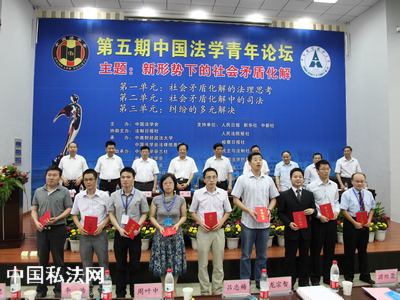 本次论坛得到了全国各级政法部门、地方法学会、法学院校的大力支持,广大法学法律工作者踊跃投稿、积极参与,截至5月5日,共收到符合要求的论文近530篇,经过严格的匿名评审,最终产生了一等奖5篇,二等奖15篇,三等奖30篇和若干优秀奖论文。中国法学会法律信息部主任李仕春教授宣读了“新形势下的社会矛盾化解”征文获奖名单,与会领导为张红等获奖的青年学者颁发荣誉证书,并与他们合影留念。