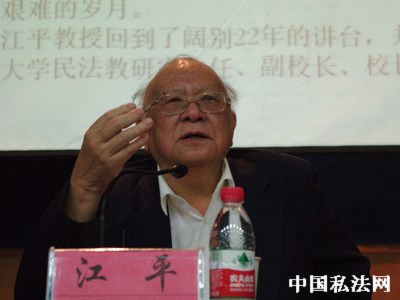 2011年11月18日晚19:30,我国著名法学家、中国政法大学终身教授、民商法专业博士生导师江平教授在中南财经政法大学文泉楼一楼学术报告厅做了主题为“法律与人生”的讲座。本次讲座由中南财经政法大学民商法研究中心主办;中南财经政法大学民商法典研究所承办;中南财经政法大学中国农村土地法律制度研究中心、中南财经政法大学侵权行为法研究所、中南财经政法大学法学院研究生会、中南财经政法大学法学院团委学生会协办。