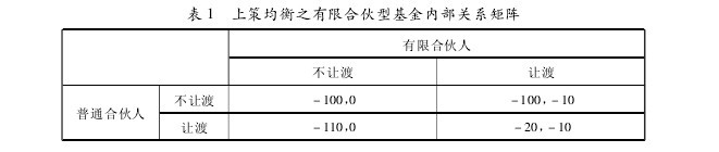 博弈论以利益最大化的个人理性假设为前提,即参与人理性意味着其总是偏好于更高收益的结果而不是更低收益的结果。基于该假设,我们来分析博弈三要素:博弈的参加者、各博弈方各自可选择的全部策略或行动、博弈方的支付或者得益在有限合伙型基金中的运用,我们可以借助于博弈论中的二元矩阵,可见下表 1 来分析涉及两个参与人的正规形式博弈。