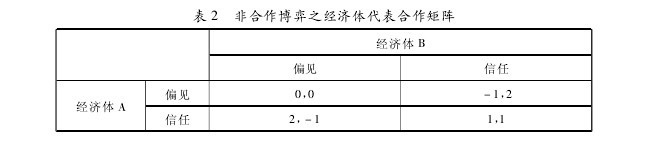 假设两个经济体代表 A 和 B 在相互信任时可获得收益为 1 单位的效用;如果一方坚持信任的策略,可获得收益为 2 单位的效用,另一方因坚持偏见而不合作,则效用下降至 -1;如果双方互不信任,各方均受偏见的危害,导致双方效用都降至 0,没有因此而获益。双方只想最大化自身效用而没有任何其他目标,并且各方对另一方的效用有无均不关心,最终双方无法相互达成一致协议,无形中提高了双方各自的交易成本,受制于对方更高的市场准入障碍并无法获得任何效用。显然,双方都不希望出现这种公共悲剧,任何一方都希望获得最大收益,然而,这种结果只能在各方参与人达成一个具有约束力的协议下才可能出现。