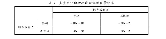 2.由于我们无法确信博弈参与方均会选择协调性监管,还可能存在双方都不协调监管的策略组合:如果对方选择不协调监管,则另一方的最优反应也是不协调监管。一旦对方选择不协调监管,另一方不论协调监管与否都将遭受违法损害,其更愿意承担 20 万元的损失而非 30 万元的损失。