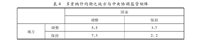 在这种策略的相互作用中考虑这种情况:每一方可以事先提出并保持一个单一策略(并决不偏离)或者进入一系列的磋商从而促使双方进入改变单一策略和调整的通常过程。我们以上表来描述这样的博弈:如果地方和国家都决定相应调整法律或地方性规范,那么就不会出现监管断层,双方从而各自获得 5 万元的收益;如果一方保持原法律或地方性规范状态,另一方不保持,监管断层也不会出现,然而不同于 10 万元剩余的平均分配,这时保持的一方将获得 7 万元而对方将获得 3 万元;如果双方都保持原法律或地方性规范状态,那么就会出现监管断层,双方各自只有 2 万元的收益。这也是一个具有三个纳什均衡的博弈,两个是纯策略均衡:一方选择保持,对方选择调整。第三个是混合策略均衡:国家和地方会在三分之一的时间里选择调整而在三分之二的时间里选择保持,双方都具有很强但相反的偏好,因此可预测的结果并不存在。国家和地方可能将选取这个混合策略均衡,或者选取某些其他的策略组合。我们需要考虑地方和国家之间相互作用的动态过程,或许能在一方做出后来不能变更的保持承诺之前进行协商。
