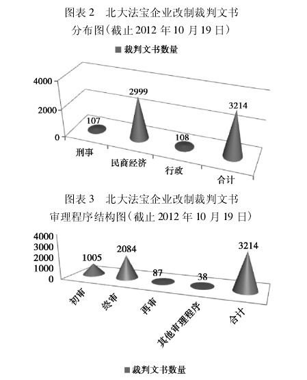 如果我们再观察一下北大法宝的案例库,不难发现,因为企业改制而引发的纠纷大量存在。当然,上述纠纷中很大一部分是由非公司制企业改制为公司制企业而发生的,但由此公司企业改制为彼公司企业的纠纷也不鲜见。这些纠纷广泛涉及股东出资、股权结构、公司治理、债务处理、职工安置、税收安排等等。截止2012年10月19日下午16:35分,以“企业改制”为关键词在北大法宝案例库中搜索,共涉及裁判文书3214篇,其中,刑事107篇,民商经济2999篇,行政108篇(参见图表2)。可见,涉及企业改制的纠纷绝对数量并不少。在这些裁判文书中,大量都是二审终审文书,这意味着改制案件,上诉率还是比较高的。例如,全部文书中,初审1005篇,终审2084篇,再审87篇,其他审理程序38篇(参见图表3)。就终审结果来看,二审维持原判案例1831篇,二审改判案例804篇,再审维持原判案例67篇,再审改判案例20篇。[13]
