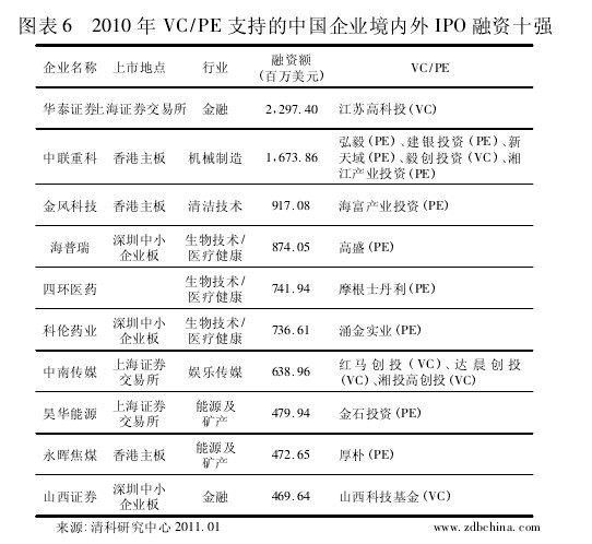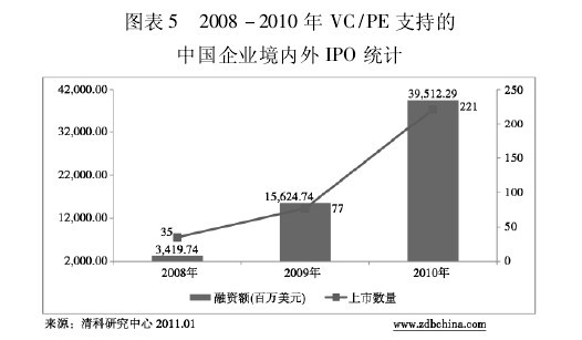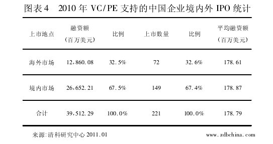 根据清科研究中心的数据,2010年,共有221家具有创投和私募股权投资机构支持的中国企业在境内外市场上市,合计融资395.12亿美元,上市数量和融资额均较2009年同期大幅增长,全年VC/PE支持的上市企业数量增加了144家,融资额增加了1.53倍。由于境内中小板与创业板的高市盈率与市场估值影响,境内共有149家VC/PE支持的企业上市,较海外市场多出77家。在境内上市的这149家企业中,平均背后有2家VC/PE机构支持。在整体市场估值偏高的情况下,VC/PE投资机构获得了较高的投资回报。尤其是随着创业板的稳定发展以及VC/PE机构的日益活跃,创业板市场已成为VC/PE退出的重要渠道(参见图表4-6)。[17]