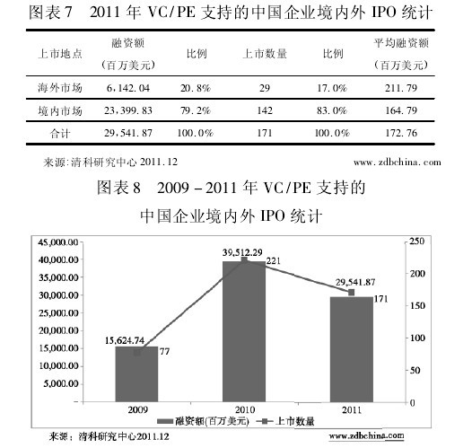 虽然2011年IPO总量下降,全年VC/PE支持的中国企业上市数量和融资额同步减少,但仍有170家具有创投和私募股权投资机构支持的中国企业在境内外市场上市,完成171起IPO,合计融资295.42亿美元。其中,由于海外IPO遇冷,VC/PE支持的中国企业海外上市大幅下滑,仅有29家企业上市,共融资61.42亿美元。142家VC/PE支持的中国企业在境内上市,占VC/PE支持的IPO总量的83.0%,融资额达到234.00亿美元,占总融资额的79.2%。在境内外上市的这171起IPO中,平均每起IPO背后有2.61家VC/PE机构支持(参见图表7-9)。[18]