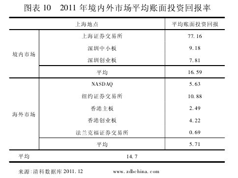在账面投资回报方面,2011年境内外资本市场获得了14.70倍的平均账面投资回报,其中境内上市的企业为VC/PE带来的平均帐面投资回报为16.59倍,海外上市的企业为投资者带来的平均帐面投资回报为5.71倍。从具体的市场来看,1月份华锐风电在上海证券交易所上市,新天域等多家机构平均获得480倍的账面投资回报,使上海证券交易所乃至境内资本市场的平均账面投资回报被整体拉高。如果剔除华锐风电的影响,上海证券交易所的平均账面投资回报为6.07倍,境内资本市场的平均账面回报为8.22倍,境内外平均账面回报为7.78倍(参见图表10)。尽管与2010年全年境内外9.27倍的平均账面投资回报相比,VC/PE机构通过IPO退出所获得的收益在逐步减少,[19]但PE仍是一种便捷的“资本暴利通道”。