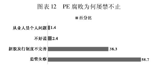 凡此种种采取各种直接或间接手段,突击入股Pre-IPO企业一夜暴富的行为,不断挑战着公众的“公平底线”。对这些不直接创造价值,却借助某些隐蔽通道、采取“暗箱操作”等方式拼命从上市公司造富神话中攫取财富的投机者——例如,各种类型的PE、保荐机构及其代表人、与相关中介机构、上市公司高管及实际控制人等有各种利害关联的关系人,以及那些打扮得毫无关联的“神秘”持股者,公众表示了强烈的不满。按照新浪调查“PE腐败何时休”的调查结果,截止到2012年10月26日,共1195名受访者接受了网上调查,当被问及你如何看待PE腐败时,有96.5%的被访问者将其视为投行潜规则(参见图表11),PE腐败仿佛已经成为公开的秘密;而在问及PE腐败为何屡禁不止时,有57.8%的人将其归为监管失察(参见图表12)。[23]可见,公众很容易将投资腐败归结为证监会的问题。