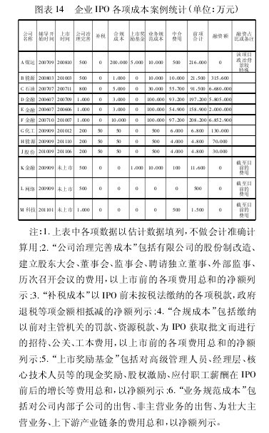 再以某券商2006-2011年间所承担的12家公司改制上市案例为例,我们可以发现,改制上市的成本支出主要体现在公司治理完善、合规、补税、业务规范、上市奖励基金以及中介费用等方面。当然,不同公司具体支出成本可能存在差异,但公司治理完善、业务规范、中介费用是其中的主要支出项目(参见图表14)。