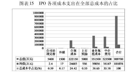 以上表中已经完成的上市案例为样本观察,我们可以发现,改制上市中各项主要支出成本在全部改制支出总额中的比值。其中,业务规范成本、中介费用和合规成本花费最多,分别占全部支出成本总额的38.64%、35.78%以及24.42%(参见图表15)。可见,上市改制主要使“改制的设计师”——券商取得巨额利益,而真正用于公司治理规范的部分并不多,占比不到1%。巨额的业务规范成本可能还包括了一些难以摆在台面上的公共开支,这似乎是业界几近公开的秘密。如果不存在改制过程,则企业上市成本可因“寻租机会”减少和“中介盘剥”减少大大削减。