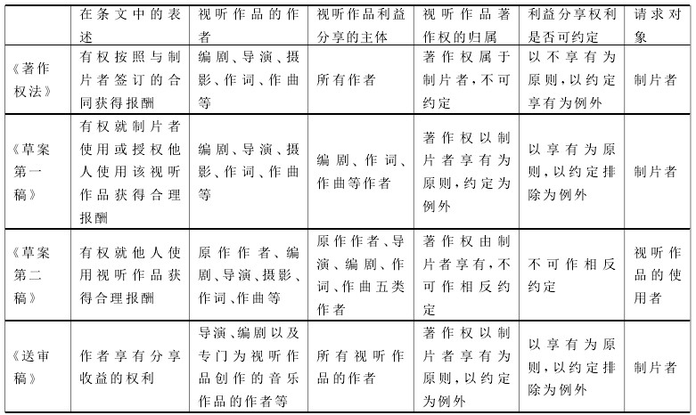 目前,修订视听作品著作权权利规定的基本思路,是让视听作品作者原则上享有利益分享权,让他们不仅可以因参与制作视听作品而获得劳动报酬,而且还应当分享视听作品的后续使用收益。例如,《草案第一稿》第16条第1款规定:“如当事人无相反书面约定,视听作品著作权由制片者享有,但编剧、导演、摄影、作词、作曲等作者享有署名权”,第3款规定:“编剧、作词、作曲等作者有权就制片者使用或授权他人使用该视听作品获得合理报酬,合同另有约定除外”。《草案第二稿》第17条第2款和第3款规定:“视听作品的著作权由制片者享有,但原作作者、编剧、导演、摄影、作词、作曲等作者享有署名权”,“原作作者、编剧、导演、作词、作曲作者有权就他人使用视听作品获得合理报酬”。《送审稿》第19条第2款和第3款规定:“电影、电视剧等视听作品的作者包括导演、编剧以及专门为视听作品创作的音乐作品的作者等……电影、电视剧等视听作品的著作权中的财产权和利益分享由制片者和作者约定。没有约定或者约定不明的,著作权中的财产权由制片者享有,但作者享有署名权和分享收益的权利。”