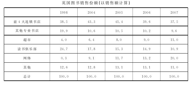 如今,网络、超市等的迅猛发展带来了新的革命,已经改变传统的完全依靠书店进行图书销售的模式。而这种变化乃是市场需求更有效的销售系统所带来的必然产物。以英国为例,其图书销售的市场构成如下:[62]