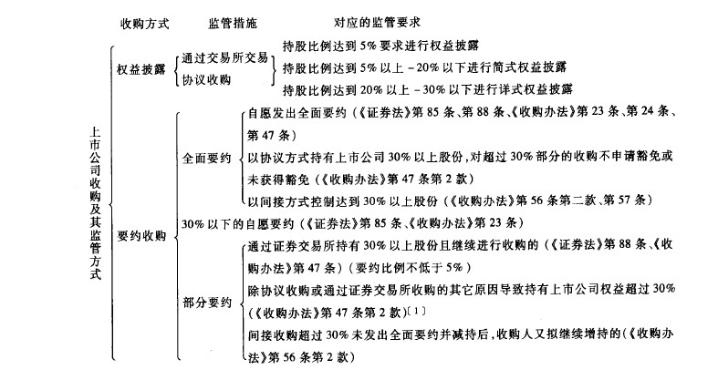 依据2005年10月27日修订后的《证券法》第四章“上市公司的收购”和中国证监会根据该法修订的《上市公司收购管理办法》(以下简称《收购法》),我国目前对上市公司收购的监管是根据收购方式的不同类别而施加不同层次的监管措施,这种监管结构主要包括持股变动披露的监管和要约收购的监管。有关监管层次及措施可如下图所示: