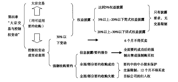 对于可引发控制权变法的大宗交易,由于此等交易会导致持股人成为上市公司的第一大股东或实际控制人,则无论其是否参与上市公司经营,均应被视为“内幕人士”看待,在监管上就要基于中小股东保护和防止内幕交易而进行制度设计,比如:(1)对于没有达到强制要约临界点但存在“控制权变化”的股份交易,出上市规则或其可能的持股期限承诺外,法律应至少规定该等控制人在获得控制权股份后的6个月不得从事目标公司证券的买卖,由此买卖获得的利润收归上市公司(归入权),违反此规定进行买卖的交易金额可作为证券监管机关进行违法行政处罚的“量刑”依据;(2)对于引发强制收购要约的情况,可以延用现有的要约价格保护、要约期限、竞争性要约、预受的撤回、强制出售权等中小股东利益保护措施规制强制要约收购行为。同时在归入权方面,可以规定无论强制要约成功与否,要约收购人在收购结束后的12个月内不得买卖目标公司股份,由此买卖获得的利润收归上市公司(归入权),违反此规定进行买卖的金额作为证券监管机关经行违法行政处罚“量刑”依据。上述监管划分可以以下图方式表示:
