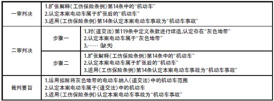 乍看之下,本裁判要旨与一审法院、二审法院均经历的步骤二一脉相承,都是将“与机动车同等的安全风险”作为是否认定为《工伤保险条例》第14条之“机动车事故”中之“机动车”的实质标准。但是,本裁判要旨较两审进一步指出,此类电动车可被“视为机动车”;换言之,裁判要旨使用了拟制的方式[26]对本案中的电动车进行了定性。结合二审法院的裁判进路,此处被“视为”的对象,却是《道交法》第119条中的机动车;换言之,裁判要旨在二审法院中之步骤一的基础上,创造了以下全新的拟制规则:“灰色地带的电动自行车”,可以被“视为”《道交法》所指的“机动车”。但这样一来,裁判要旨与二审法院的判决便产生了明显的矛盾,其与二审法院“无权将突破技术参数的‘电动自行车’界定为