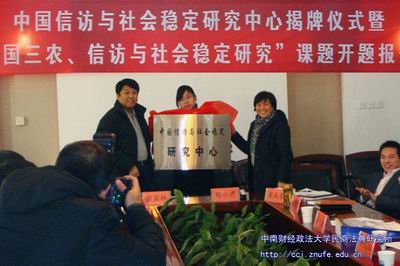 2011年1月11日,中国信访与社会稳定研究中心揭牌仪式暨“中国三农、信访与社会稳定研究”开题报告会于中南财经政法大学召开。该中心设立的目的在于加强有中国特色的信访理论研究,加强有关社会稳定和社会矛盾问题的理论研究,并在此基础上形成对理论发展和实践工作有指导意义的理论系统和制度设计。