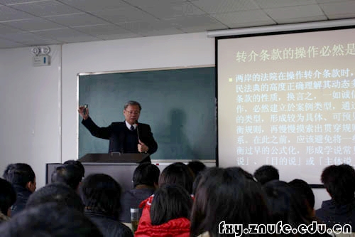 2009年11月20日下午,著名法学家苏永钦教授光临我校,在文添楼为老师和同学们做了一场“合同法§52(5)的适用——再从民法典的角度论转介条款”的学术报告。法学院副院长雷兴虎教授、民法系主任彭俊良副教授出席了本次讲座,法学院博士生、研究生等300余人共享了此次学术大餐。