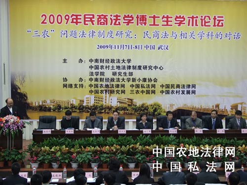 由中国农村土地法律制度研究中心、法学院、研究生部主办的2009年民商法学博士生学术论坛:“三农问题”法律制度研究——民商法与相关学科的对话已圆满落下帷幕。来自中国社会科学院、中国人民大学、武汉大学、华中科技大学、华中师范大学、华东政法大学、西南政法大学、西北政法大学等14所高校、科研院所的30余名博士生和博士后研究员出席并提交了论文。