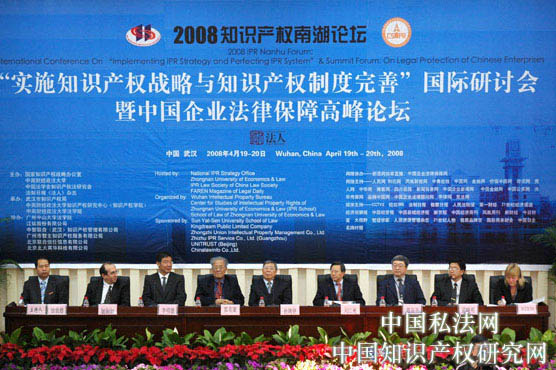2008年4月19日—20日,由教育部人文社会科学重点研究基地、国家保护知识产权工作研究基地——中南财经政法大学知识产权研究中心(以下简称“知识产权研究中心”)承办的“实施知识产权战略与知识产权制度完善”国际学术研讨会暨中国企业法律保障高峰论坛在武汉隆重召开。